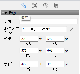 ポップアップヘルプは、レイアウト編集画面で、インスペクタから設定します。設定したいオブジェクトを選択した状態で、インスペクタの一番左にある「位置」タブを選択して、「ポップアップヘルプ」の欄に表示したいものを入力します。もちろん、計算式での設定も可能なので、関数を使ったりすることもできます。