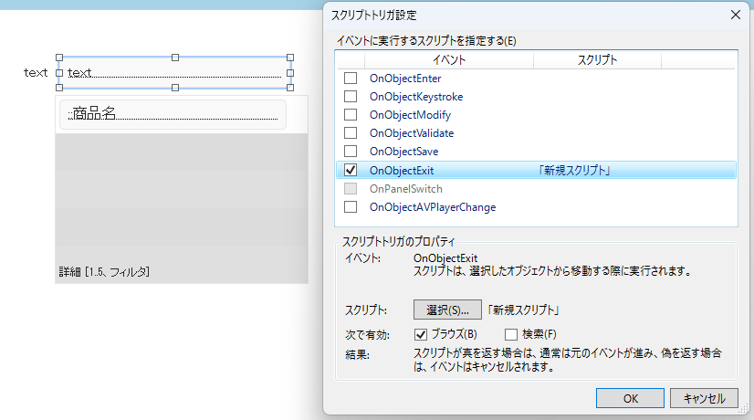 さらに、このスクリプトを検索条件を入力するためのフィールドに設定します。OnObjectExitOnObjectSaveに設定しておくと作動するはずです。